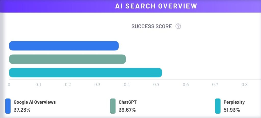 Platform Level: Compare how you perform across Google AI Overviews, ChatGPT, and Perplexity. You might discover you’re strong in Google but weak in ChatGPT—or vice versa.