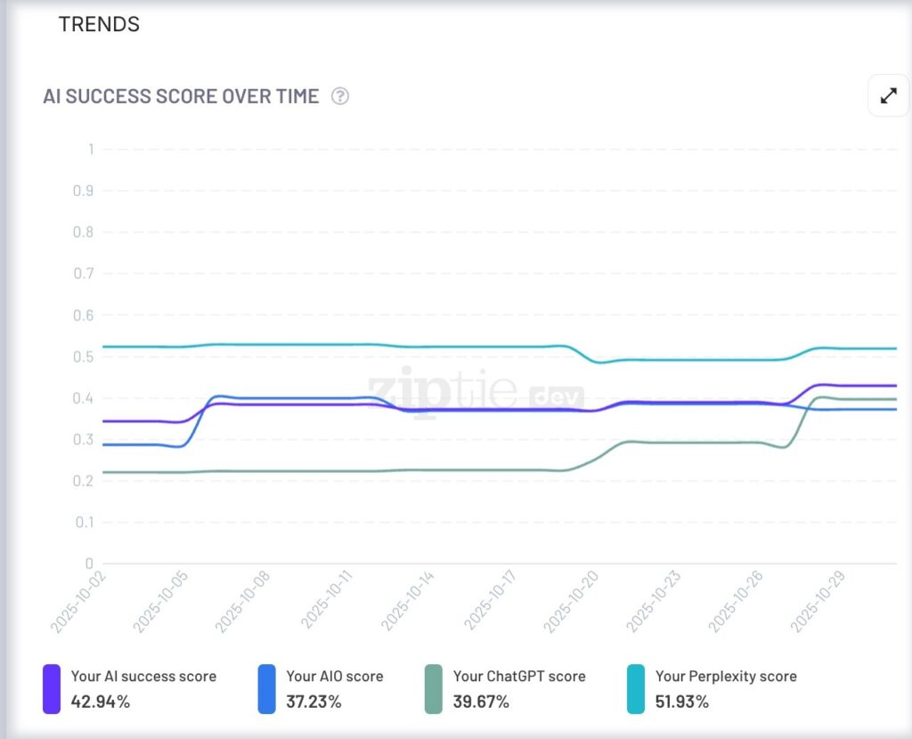 ZipTie, a specialized AI search monitoring tool, has developed metrics to track exactly that – your brand’s visibility across multiple AI-generated responses.