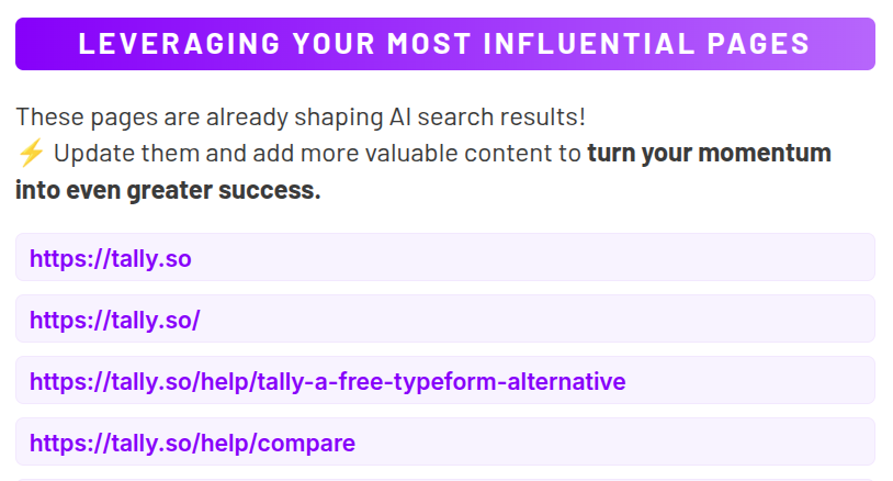 We identify the pages on your website that have the biggest impact on AI search results. These are your golden opportunities — since AI engines already trust these pages, updating them with fresh, valuable content can significantly boost your visibility.