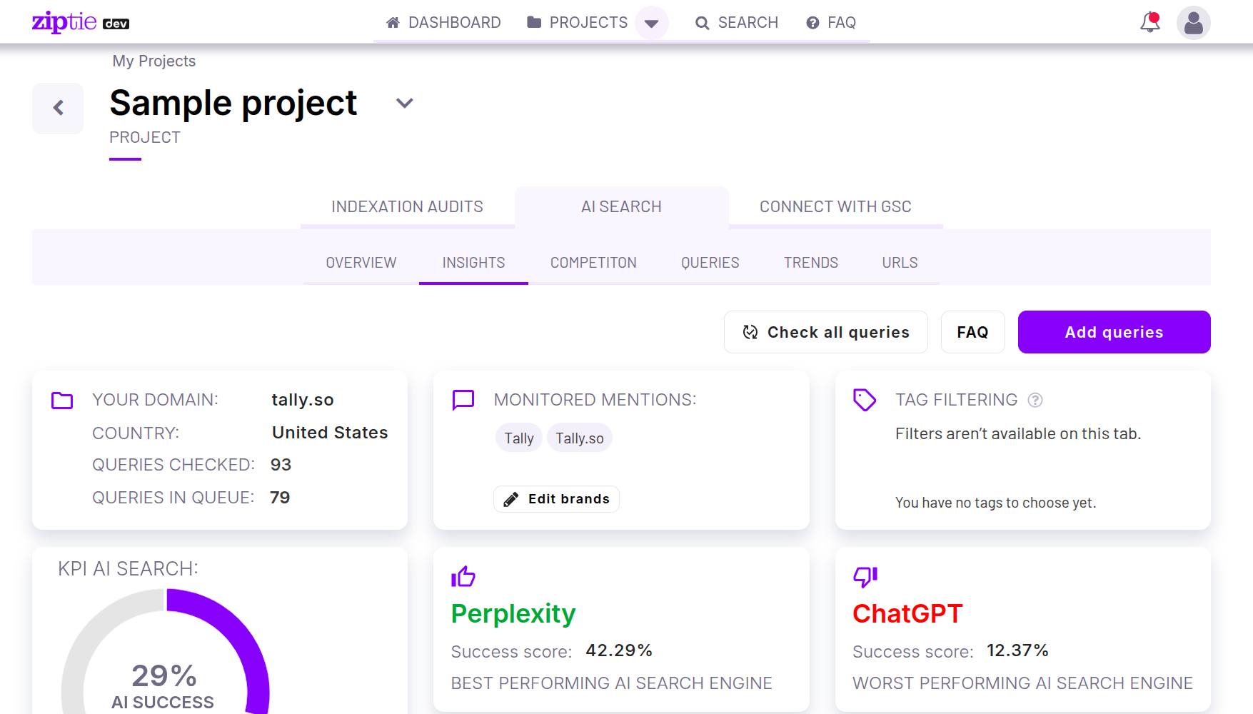 At the top of your Ziptie.dev dashboard you will find an insights tab, you’ll see a quick overview of your AI performance, including: