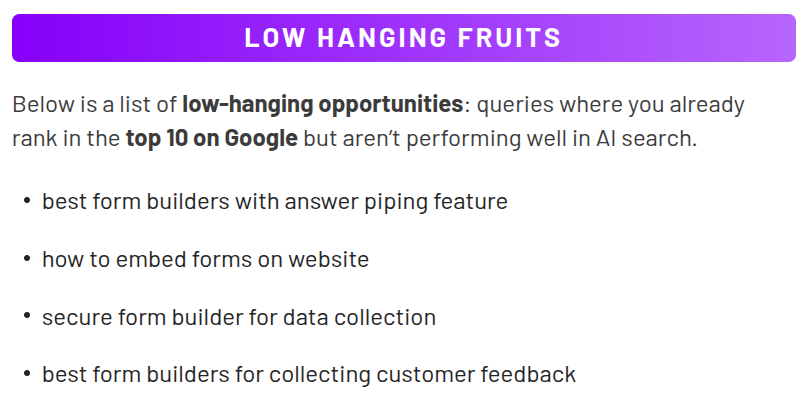 We show you queries where you already rank in Google’s top 10 but aren’t performing well in AI search. These represent quick wins — small optimizations that can lead to big improvements.